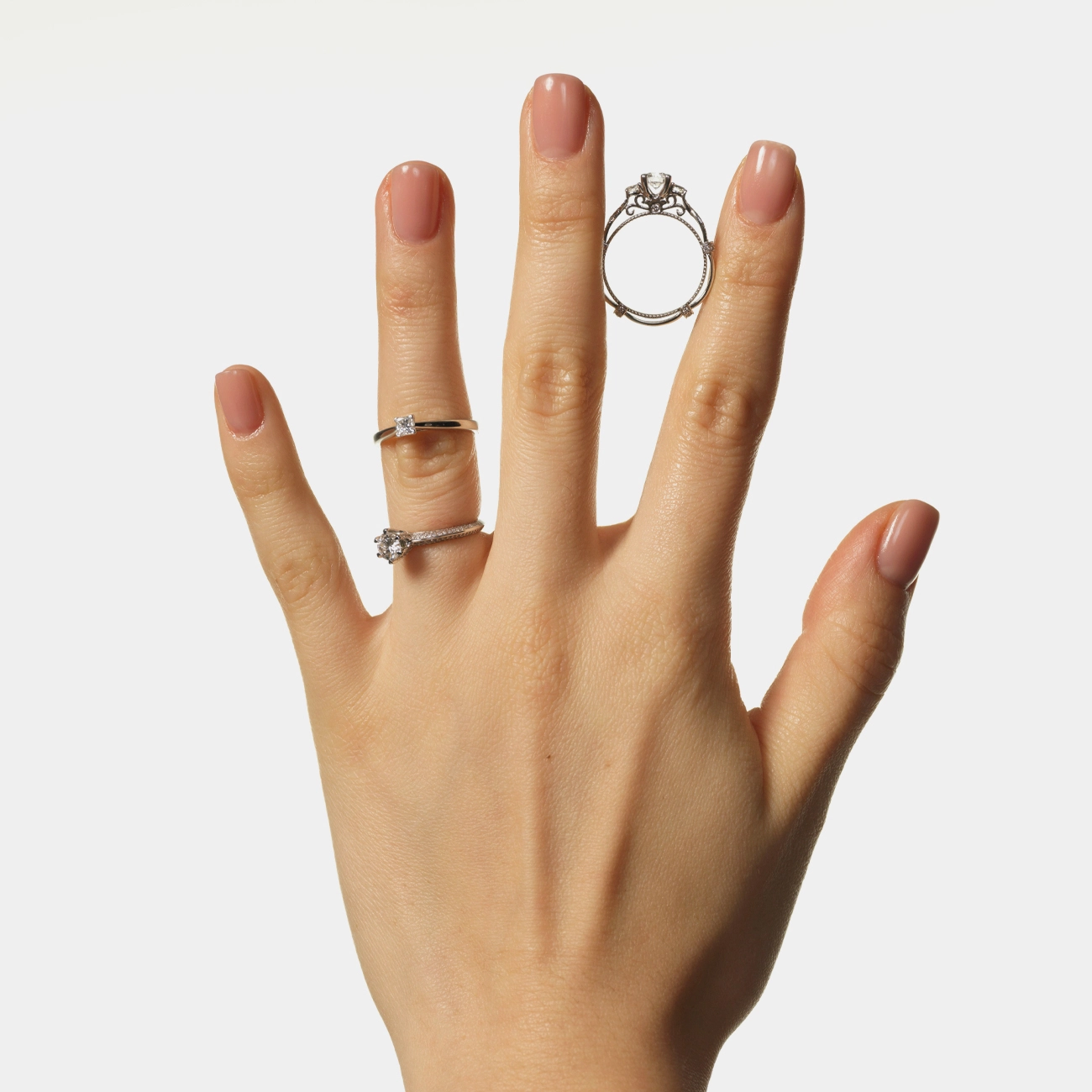 A sophisticated vintage white gold ring, adorned with a large central diamond and an elegant lace ornament. The openwork details and additional diamond scattering create a luxurious, royal look. An ideal choice for lovers of a unique, filigree style.
