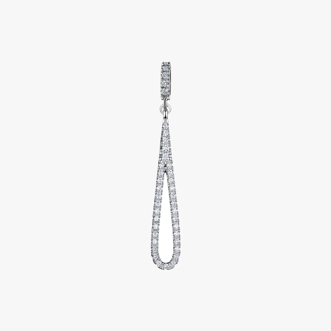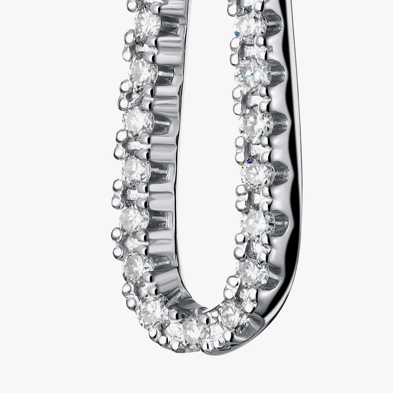 An elegant white gold pendant is made in the shape of an elegant drop - a symbol of purity, femininity and harmony. The contour of the decoration is inlaid with natural diamonds, which create a continuous line of radiance and emphasize the lightness and elegance of the form. The elongated silhouette of the drop visually stretches the neck line, making the image more gentle and noble. The diamond inlay gives the decoration a spectacular shine that plays beautifully in the light with every movement. The upper element of the pendant is also decorated with diamonds, ensuring the integrity and completeness of the design.