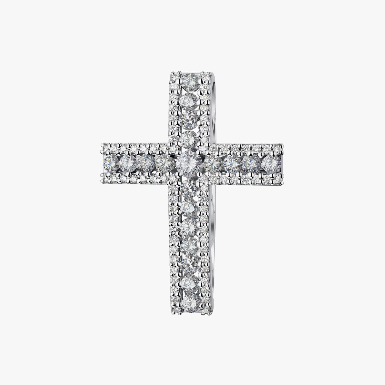 An elegant cross pendant made of white gold, encrusted with sparkling diamonds in three rows. The central stone attracts attention with its bright radiance, and the harmonious placement of the stones creates the effect of luxurious shine from all sides. The restrained but elegant design makes this jewelry a great choice for both everyday wear and special occasions.