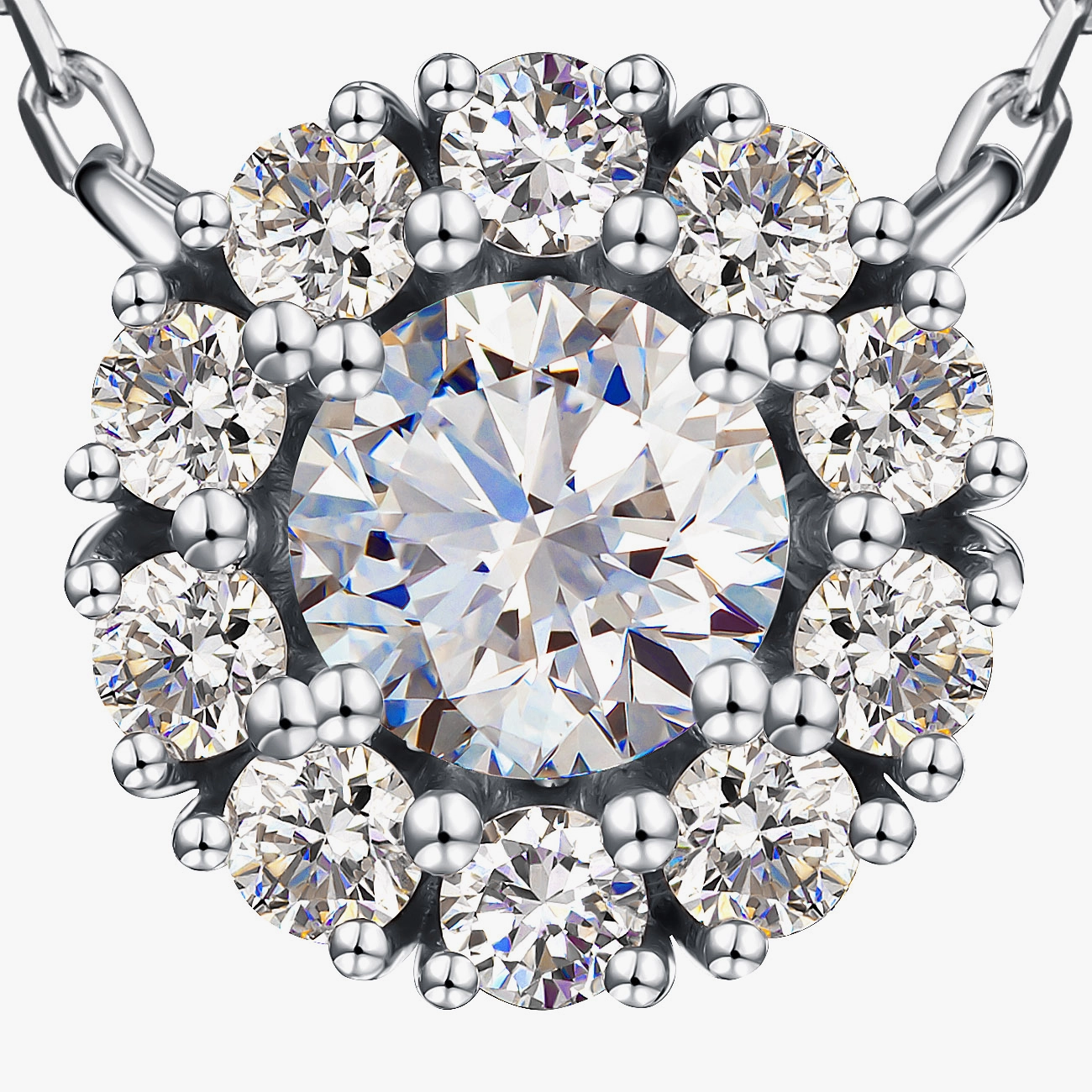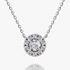 Це вишукане кольє — втілення класичної елегантності. Воно має круглий кулон, в центрі якого сяє великий, кругло огранений діамант. Його оточує інкрустований "гало" з менших діамантів, що посилює блиск та створює ефектний ореол світла. Кольє та кулон виготовлені з білого золота або платини, що забезпечує міцність та підкреслює чистоту каменів. Це ідеальна прикраса для особливих моментів або як розкішний подарунок, що ніколи не вийде з моди.