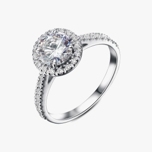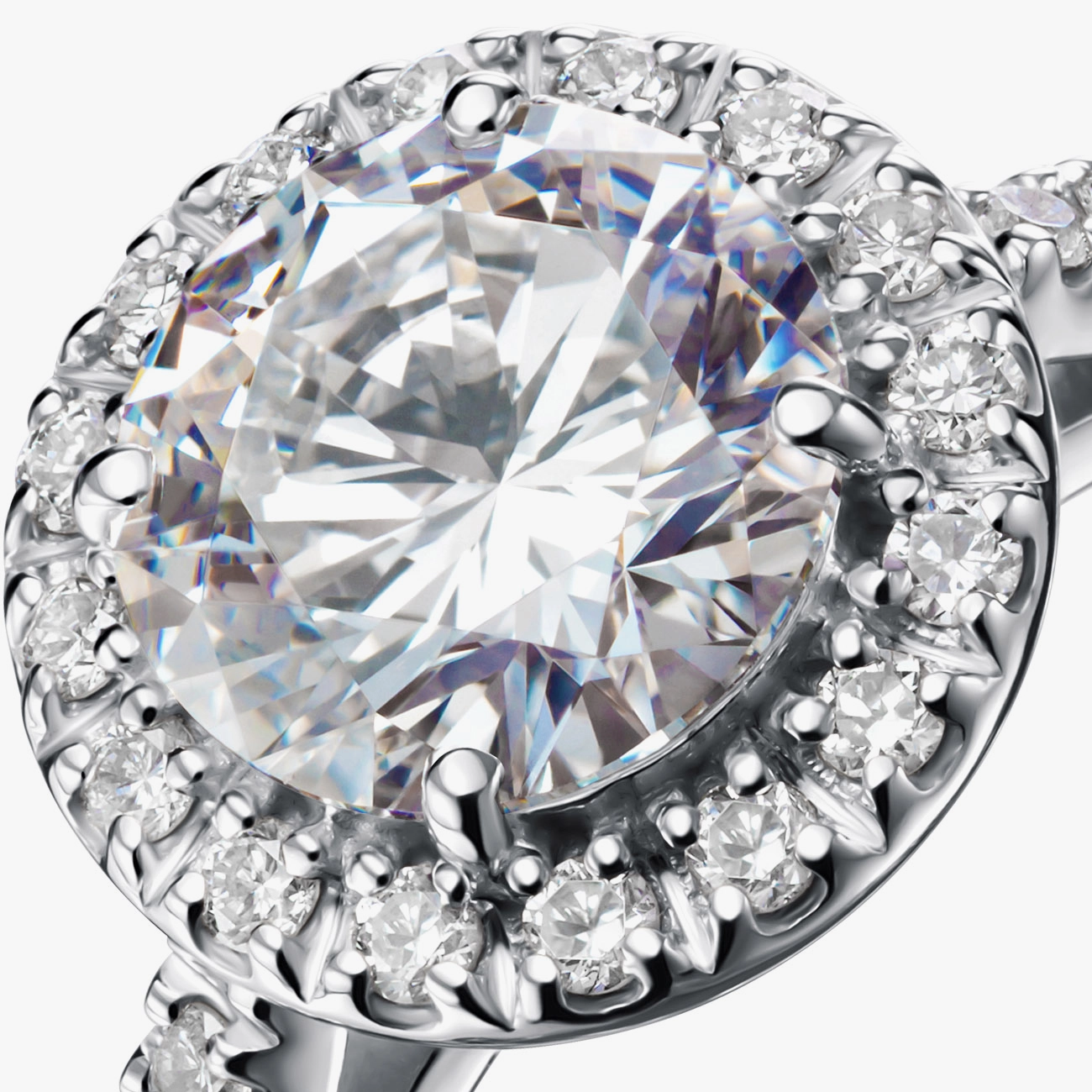 Розкішна каблучка з білого золота, інкрустована центральним діамантом вагою 1 карат, обрамленим розсипом дрібніших каменів. Витончений дизайн підкреслює блиск та глибину сяйва діаманта, створюючи ефект справжнього шедевра ювелірного мистецтва. Ідеальний вибір для заручин або як подарунок, що символізує кохання, розкіш і вічність від Kimberli.