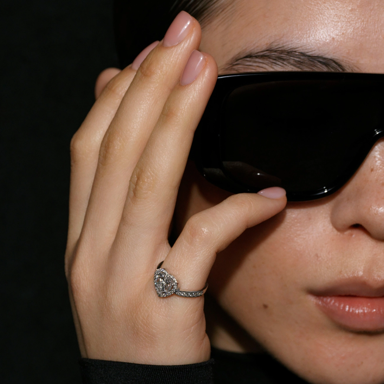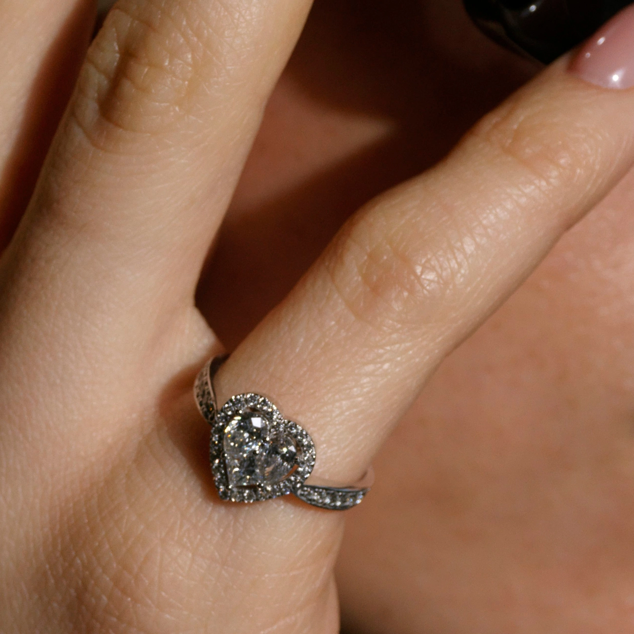 Витончене кільце з білого золота із серцеподібною композицією з двох великих діамантів у центрі, обрамлених блискучими дрібними камінцями. Обруч також інкрустовано діамантами, що підсилюють загальний блиск та розкіш прикраси. Символіка серця втілює любов і ніжність, роблячи це кільце ідеальним вибором для освідчення або ювілейного подарунка.