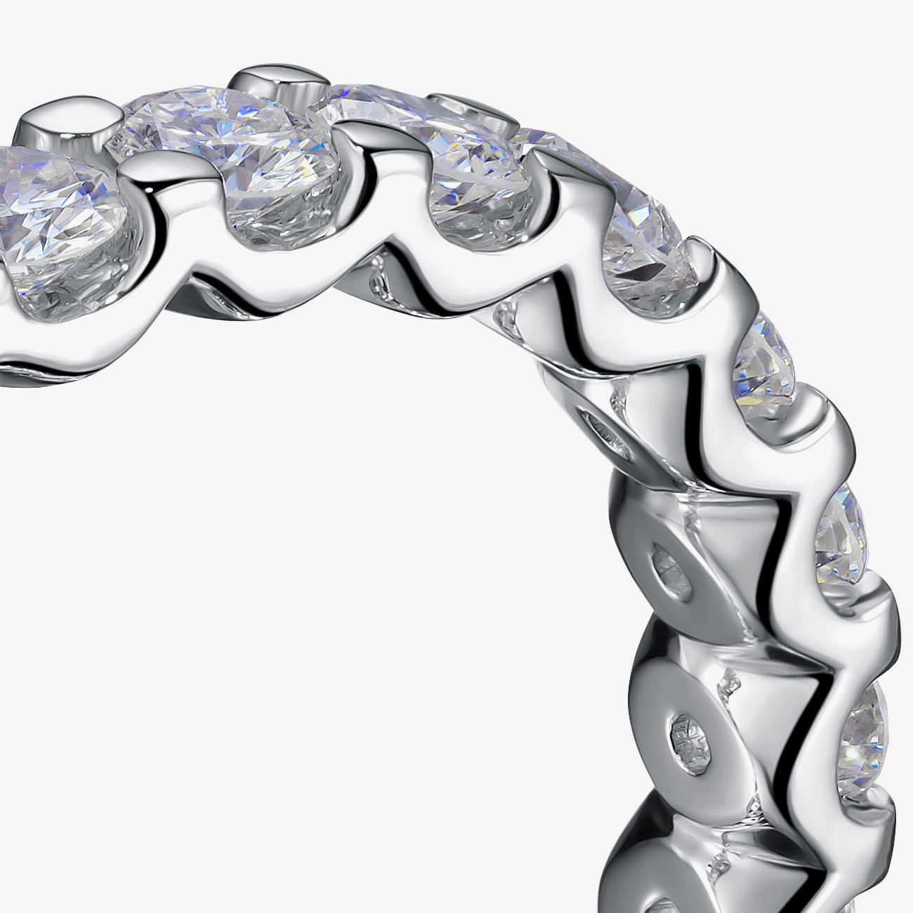 Витончена каблучка з білого золота, інкрустована діамантами по всьому колу, символізує вічне кохання та гармонію. Кожен камінь майстерно закріплений, утворюючи безперервне сяйво, що переливається при кожному русі. Ідеальний вибір для весілля, річниці чи як знак вічних почуттів.