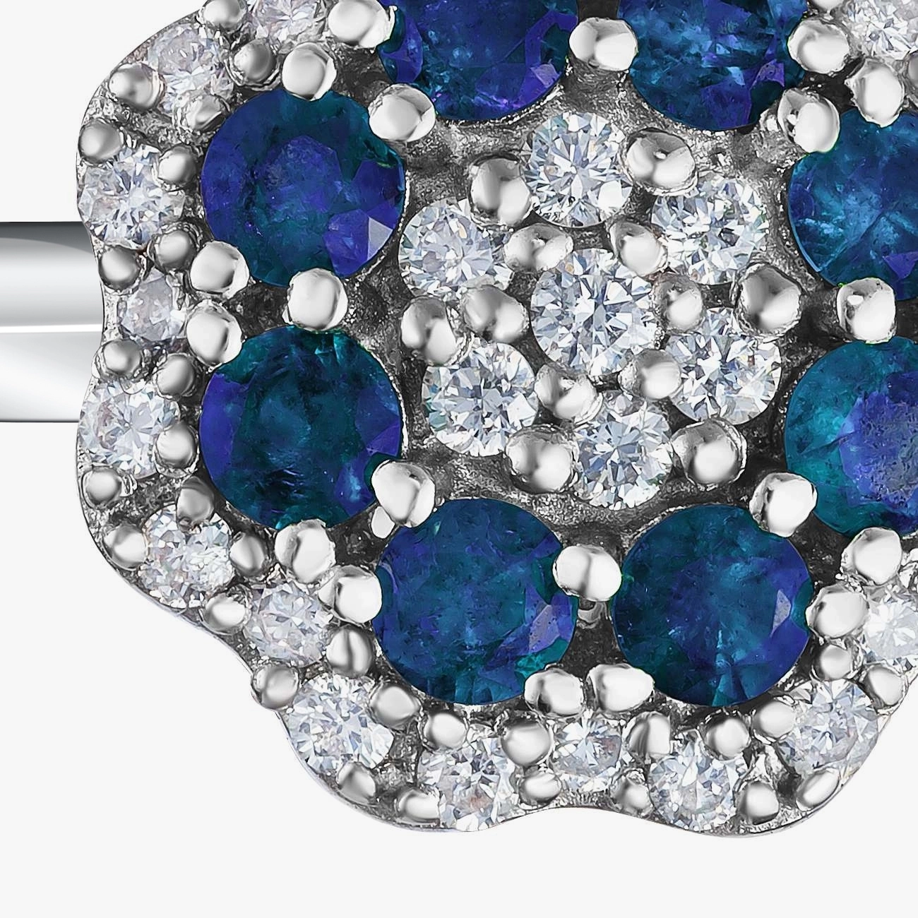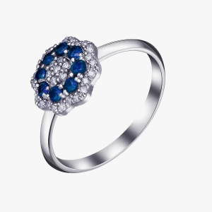 Вишукана каблучка з білого золота, оздоблена глибокими синіми сапфірами, що утворюють елегантний квітковий мотив. Центральну композицію підкреслює сяйво дрібних діамантів, які додають прикрасі витонченості та блиску. Легка, акуратна форма робить цю каблучку ідеальною для щоденного носіння та особливих моментів. Стильний вибір для жінки, яка цінує класику та справжню ювелірну майстерність.
