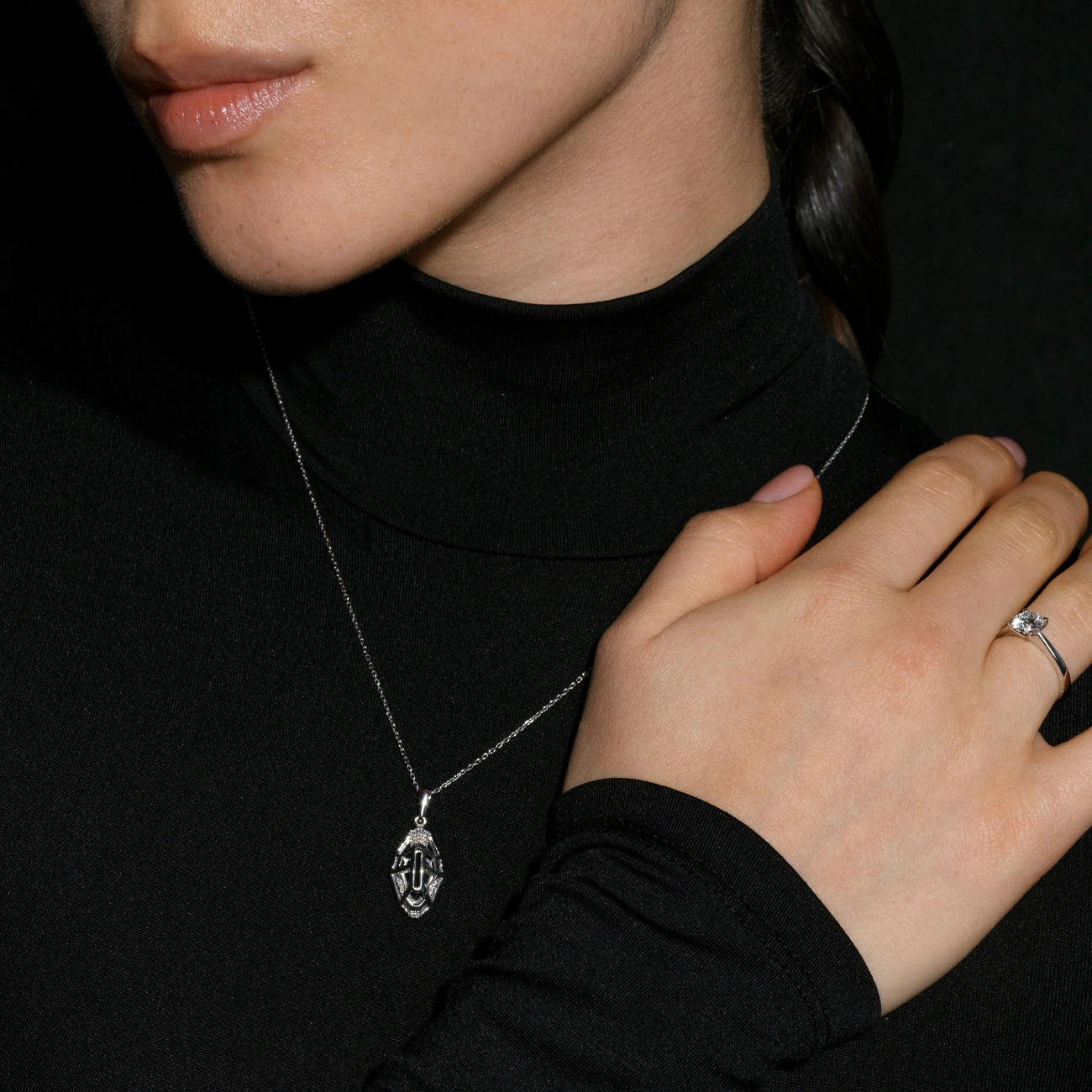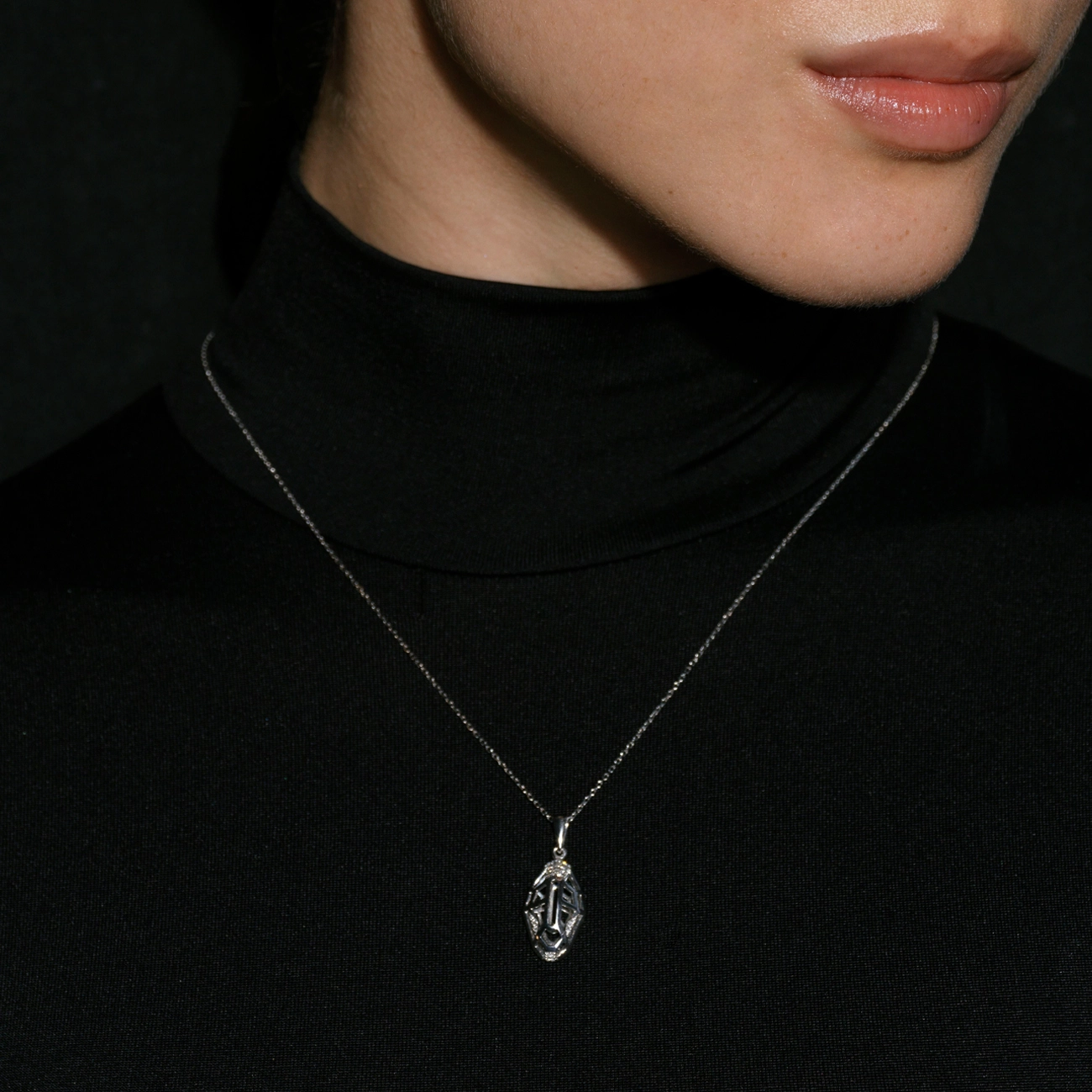 Ця витончена підвіска у формі голови змії виконана з білого золота 585 проби й оздоблена блискучими білими діамантами. Геометричний стиль у поєднанні з відкритими формами створює враження легкості й сили водночас. Символ трансформації та мудрості, змія у такій інтерпретації підходить як сучасним модницям, так і прихильницям глибокої символіки в аксесуарах. Ідеальна для подарунка або виразного акценту в образі.