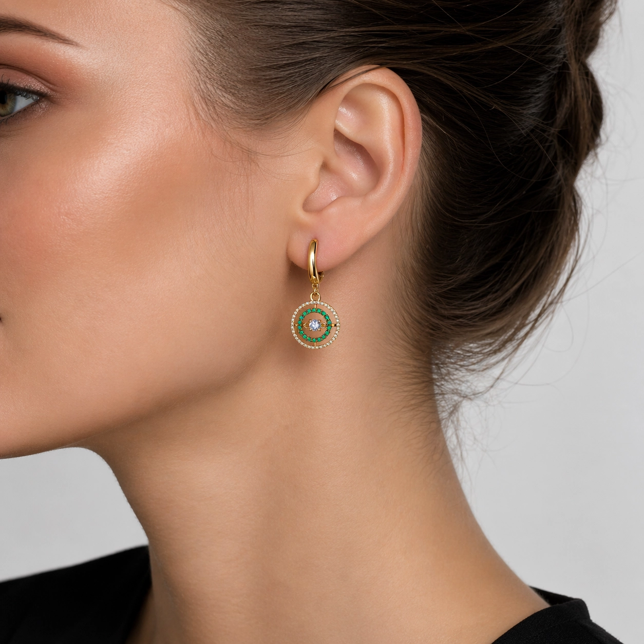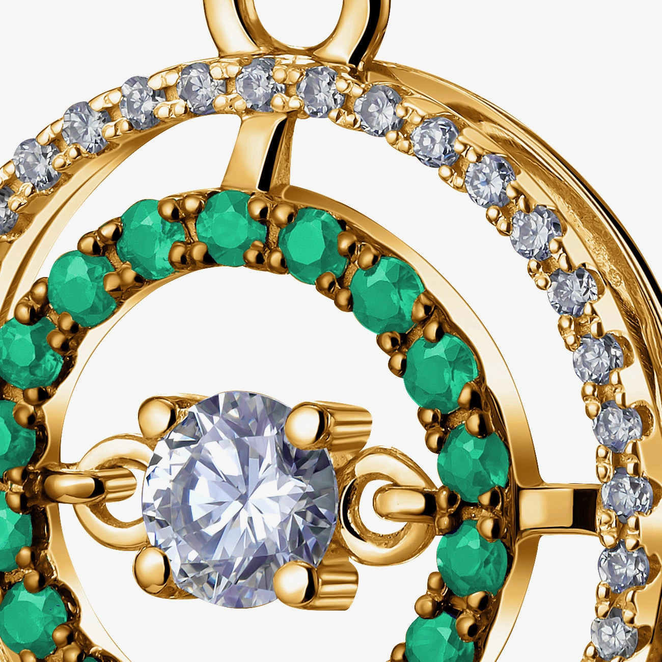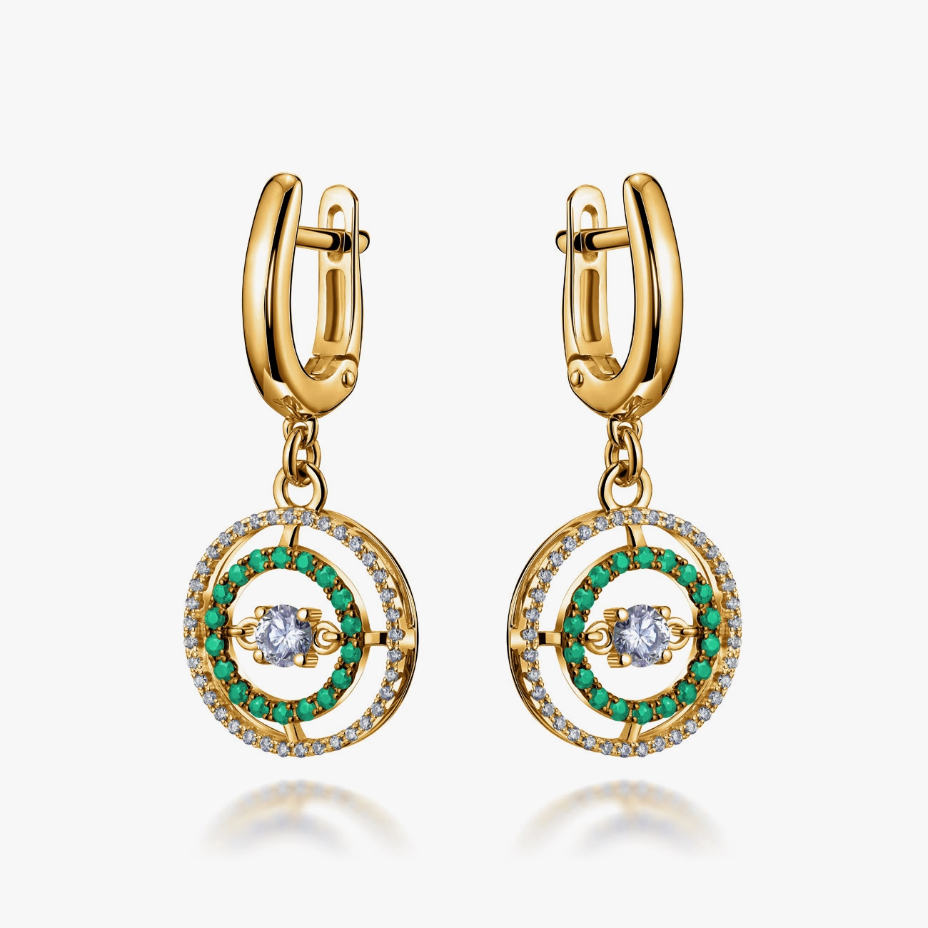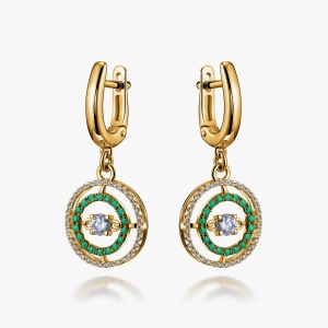 Ефектні сережки з жовтого золота втілюють сучасну елегантність і яскравий характер дорогоцінних каменів. Центральний прозорий камінь гармонійно доповнений подвійним ореолом із сяючих діамантів та насичених зелених смарагдів, що створює вишуканий контраст і глибину блиску. Підвісна конструкція додає легкого руху та розкішного сяйва при кожному жесті. Надійна англійська застібка забезпечує комфорт і зручність у щоденному носінні. Ідеальний вибір для святкового образу, особливого подарунка або колекції коштовних прикрас.