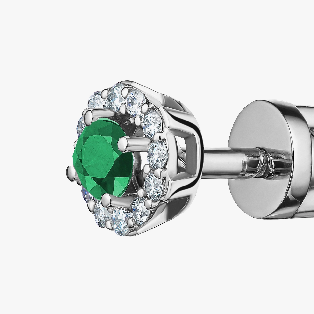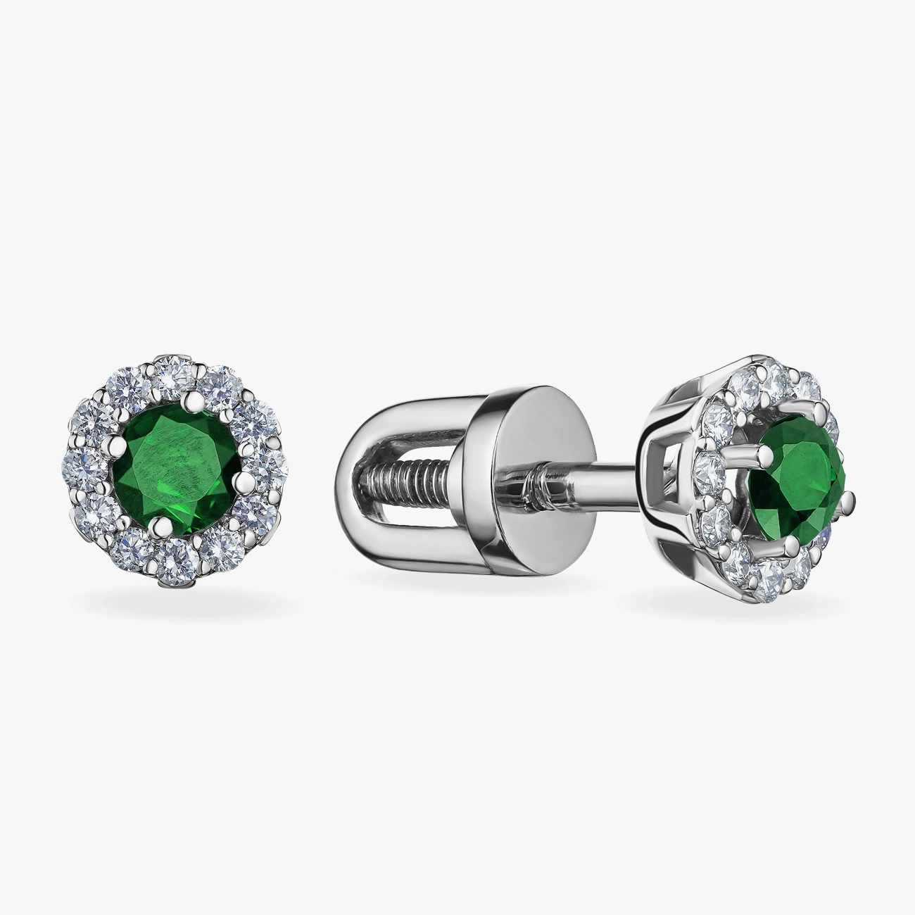 Вишукані сережки з білого золота 585 проби з центральними смарагдами насиченого зеленого кольору, обрамленими діамантами. Класична кругла форма підкреслює благородний блиск каменів і створює вишукану гармонію кольору та сяйва. Ідеальний вибір для жінки, яка цінує елегантність, традиції та непідвладну часу красу.