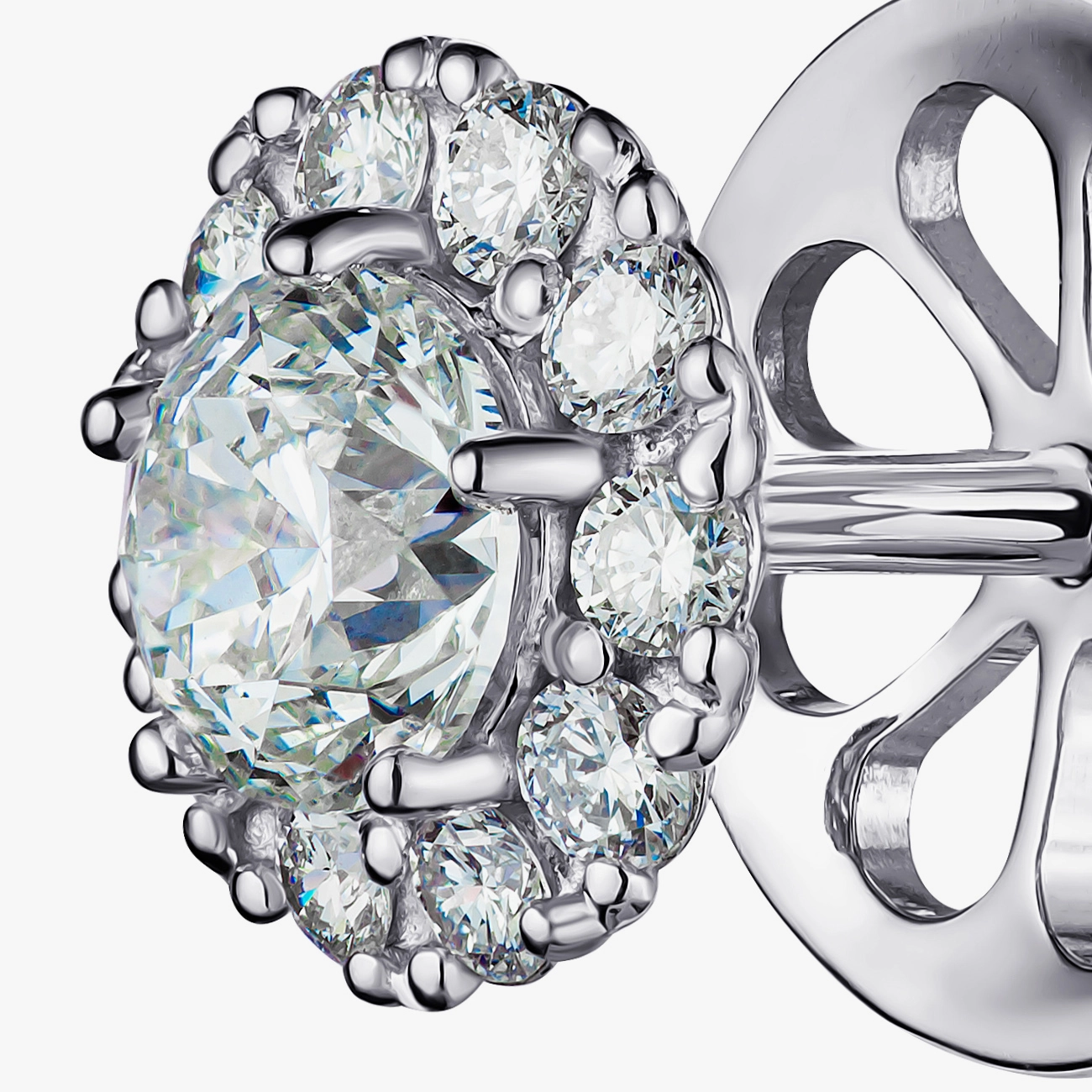 Вишукані сережки-пусети, створені з білого золота, вражають класичною елегантністю та сяйвом натуральних діамантів. У центрі кожної сережки розміщено крупний діамант круглого огранювання, який підкреслюється розкішним ореолом із дрібніших каменів. Така композиція посилює гру світла, візуально збільшуючи центральний діамант та створюючи ефект яскравого «світіння». Надійна гвинтова застібка забезпечує комфорт і безпечне носіння щодня. Ці пусети стануть універсальною прикрасою для будь-якого образу — від повсякденного до вечірнього, а також ідеальним подарунком для особливих моментів.