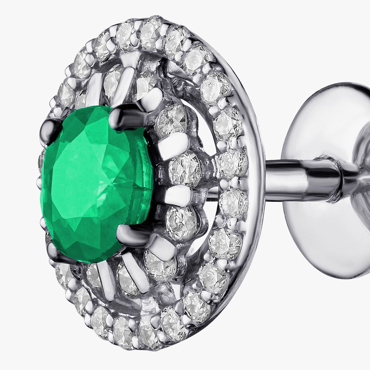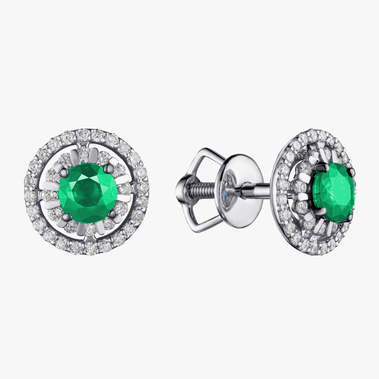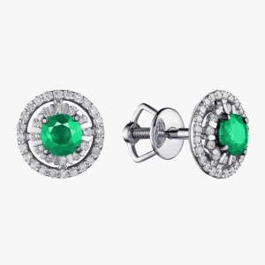 Розкішні сережки з білого золота з центральними смарагдами насиченого зеленого кольору, обрамленими блискучим ореолом діамантів. Класична кругла форма створює ефект м’якого сяйва, підкреслюючи природну красу дорогоцінних каменів. Завдяки надійному гвинтовому замку сережки зручно сидять на вусі, поєднуючи елегантність і комфорт. Ідеальний вибір для витонченого вечірнього образу або стильного щоденного акценту.