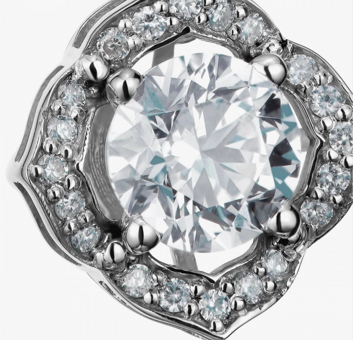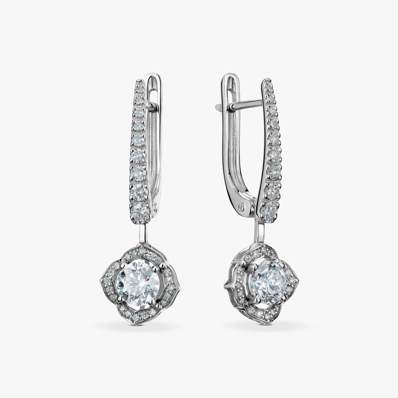 Елегантні сережки з білого золота 585 проби, виконані у вишуканому класичному стилі. Центральний діамант круглого огранювання розміщений у декоративному касті та доповнений сяйливим ореолом з дрібних діамантів, що створює ефект об’ємного блиску. Подовжена частина сережок інкрустована діамантовою доріжкою, яка підкреслює витончену форму та додає прикрасі легкості. Англійський замок гарантує надійну фіксацію та комфорт під час носіння. Ідеальний вибір для поціновувачів стриманої розкоші та бездоганної ювелірної класики.