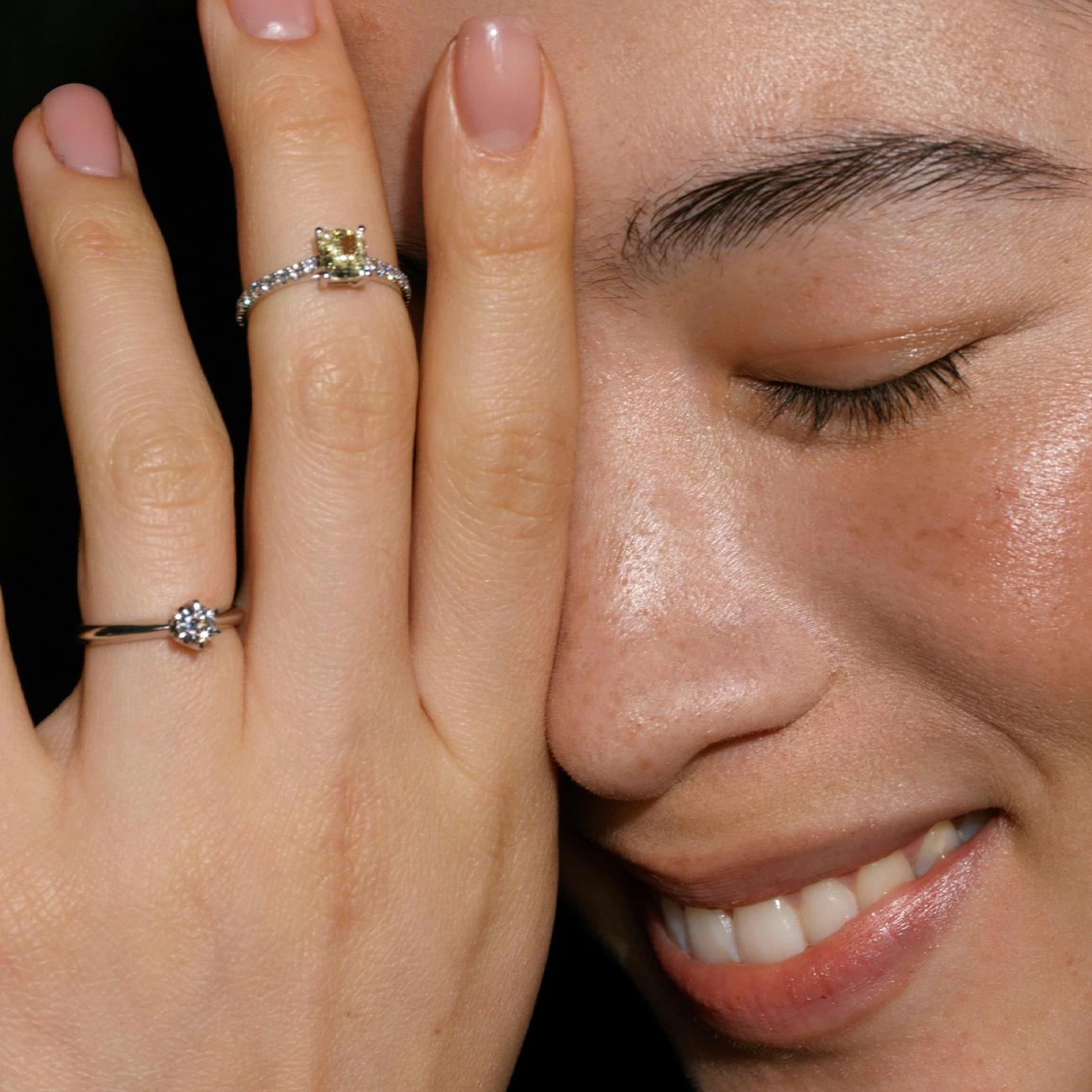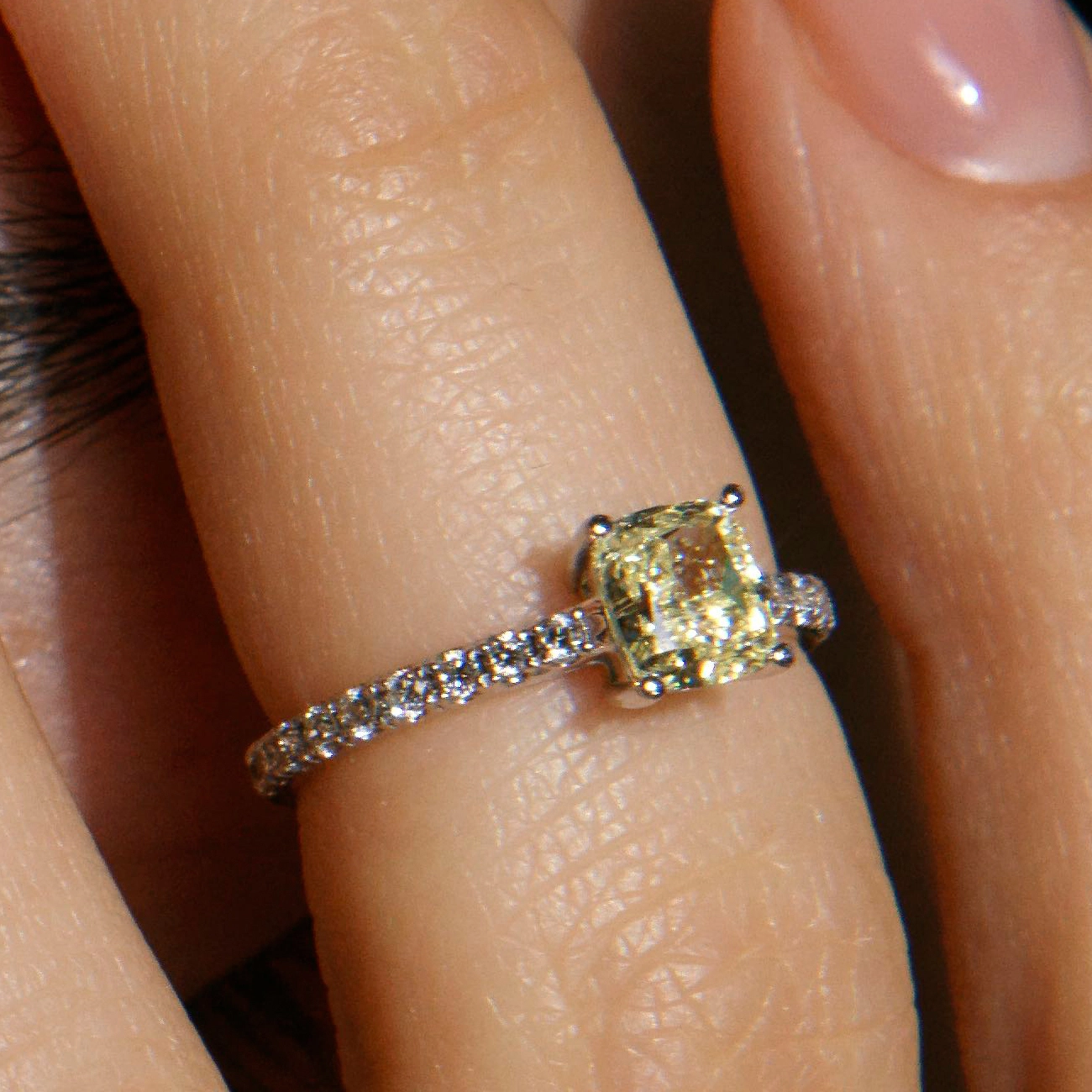 Элегантное кольцо из белого золота, инкрустированное ярким желтым бриллиантом в форме скорняка в центре. Боковые стороны ободка украшены россыпью прозрачных бриллиантов, усиливающими блеск центрального камня и создающими роскошный контраст. Это украшение для подлинных ценителей оригинальных и смелых решений в ювелирном искусстве.