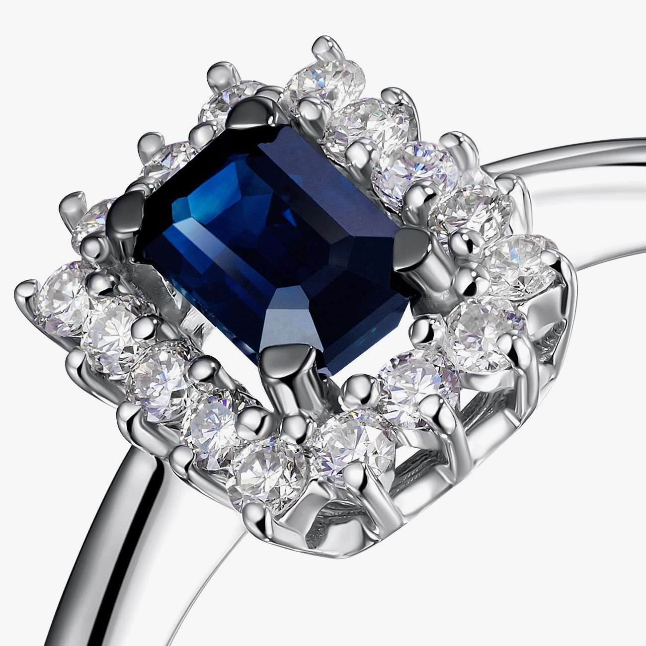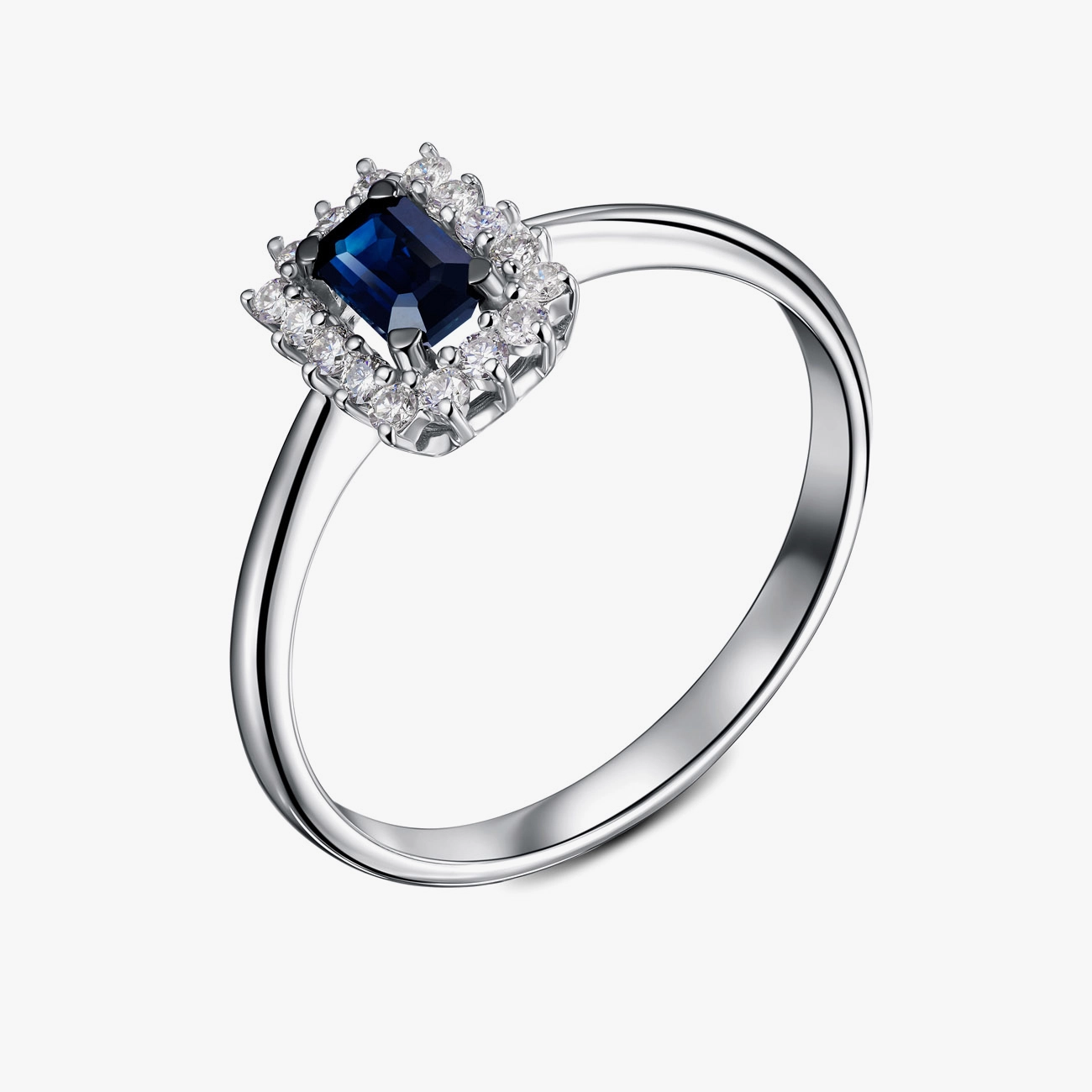 Изысканное золотое кольцо, украшенное глубоким синим сапфиром прямоугольной формы в центре. Камень подчеркнут сияющим обрамлением из круглых бриллиантов, что создает элегантный контраст и придает изделию роскошный блеск. Лаконичный дизайн делает это украшение идеальным выбором как для признания, так и для особых торжественных моментов.