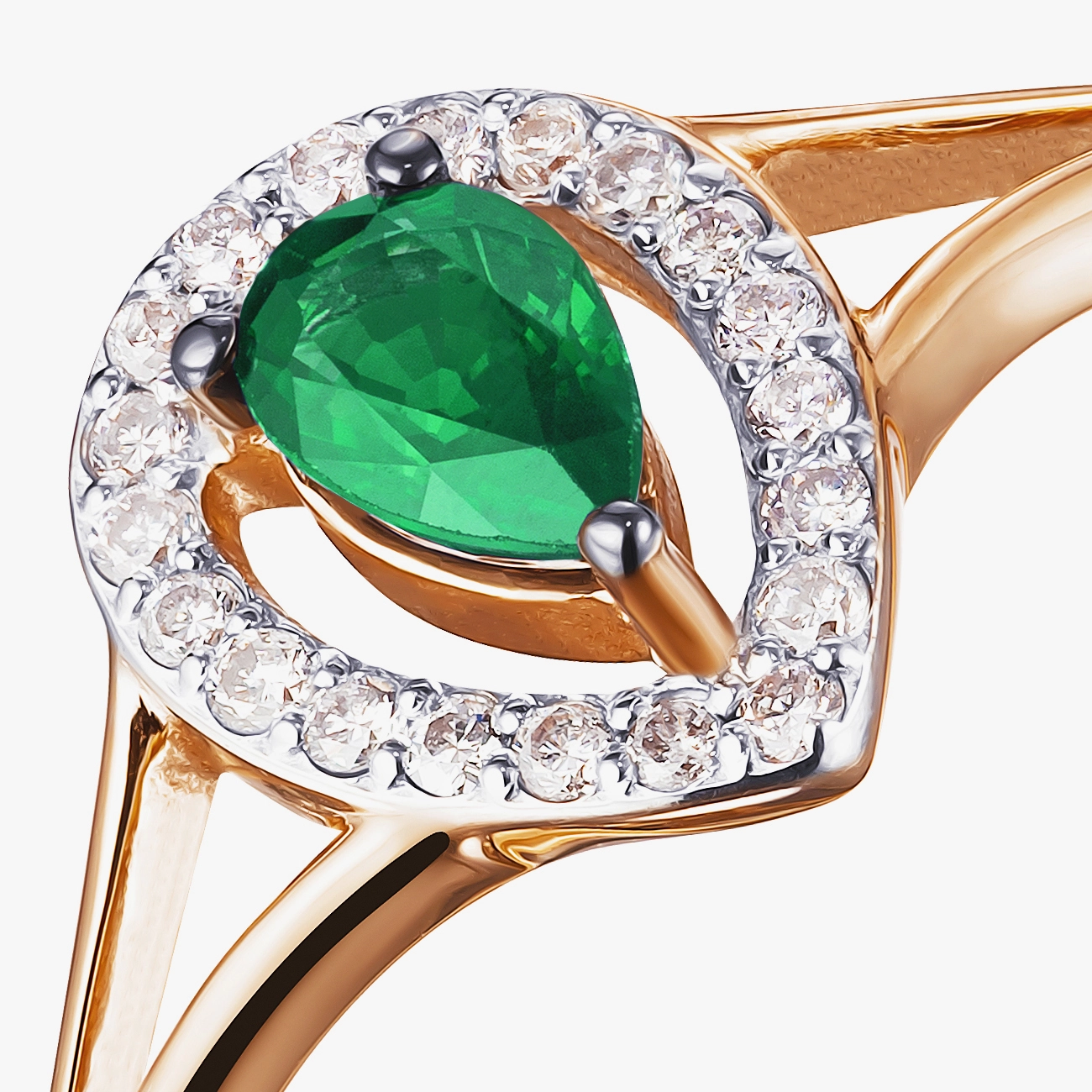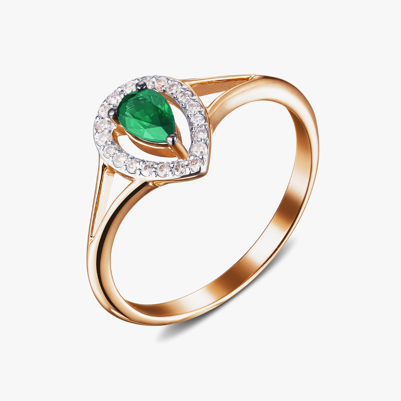 Изысканное кольцо из красного золота 585 пробы с натуральным изумрудом грушевидной формы в центре, окруженном блеском мелких бриллиантов. Такой дизайн сочетает нежность и благородство, создавая образ, исполненный женственности и элегантности. Изумруд символизирует гармонию, мудрость и вечную молодость, а бриллианты придают сияние и утонченность. Для подарка любимой женщине или как украшение для особых событий, что подчеркнет индивидуальный стиль и утонченный вкус.