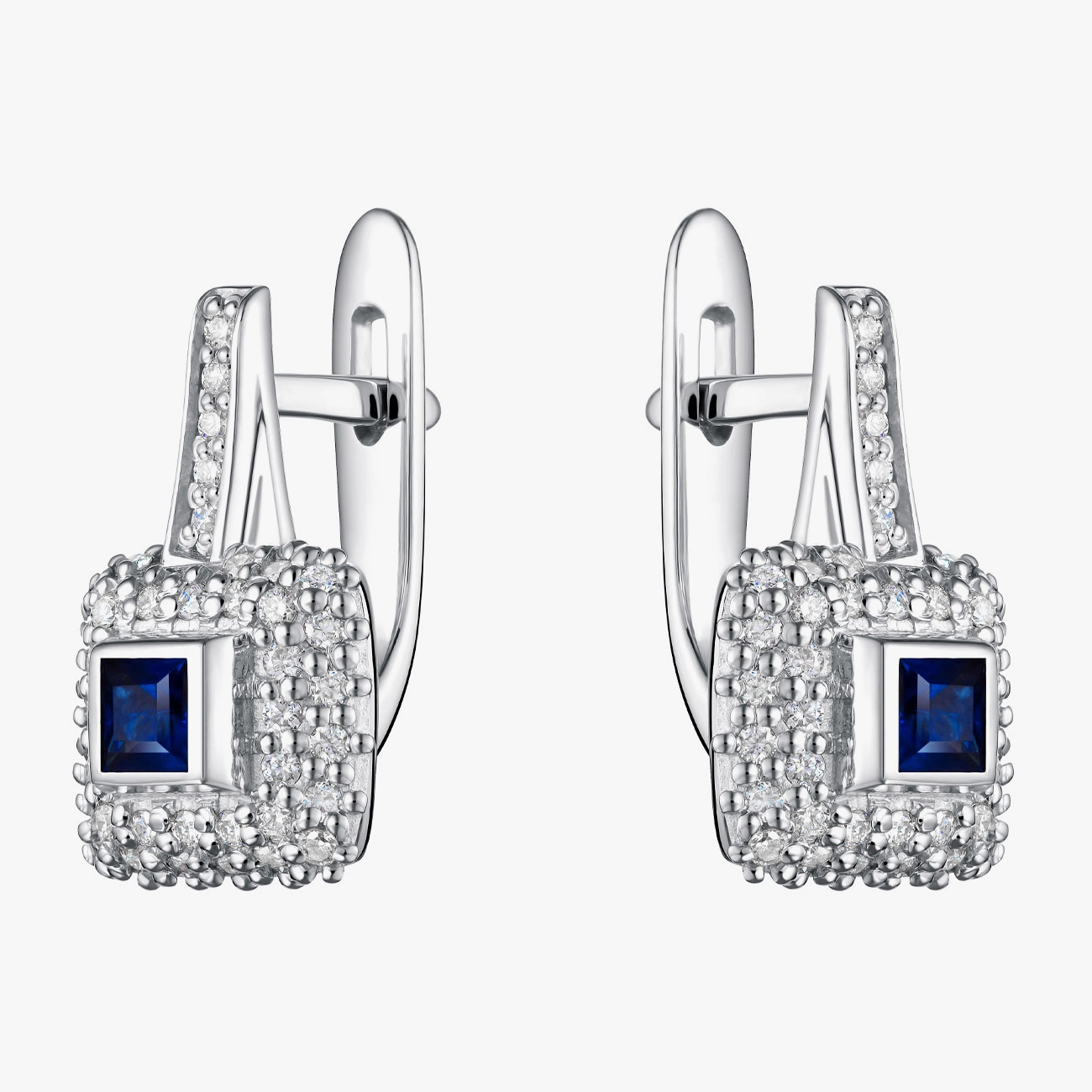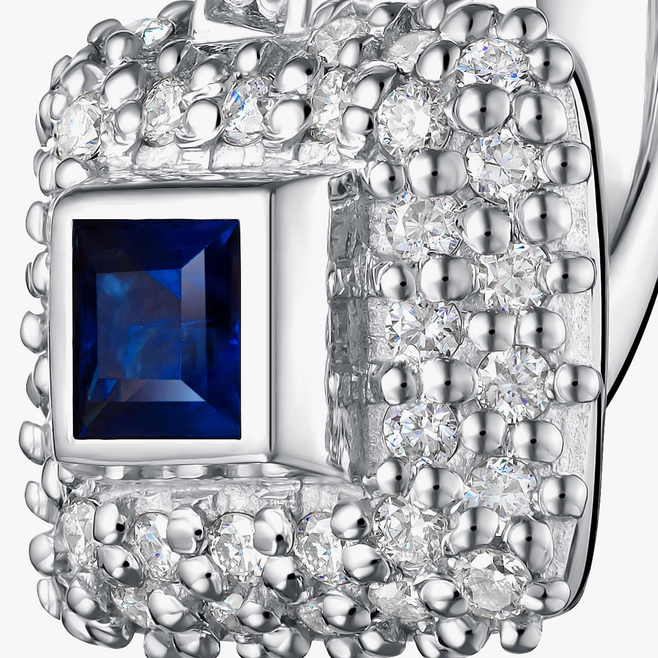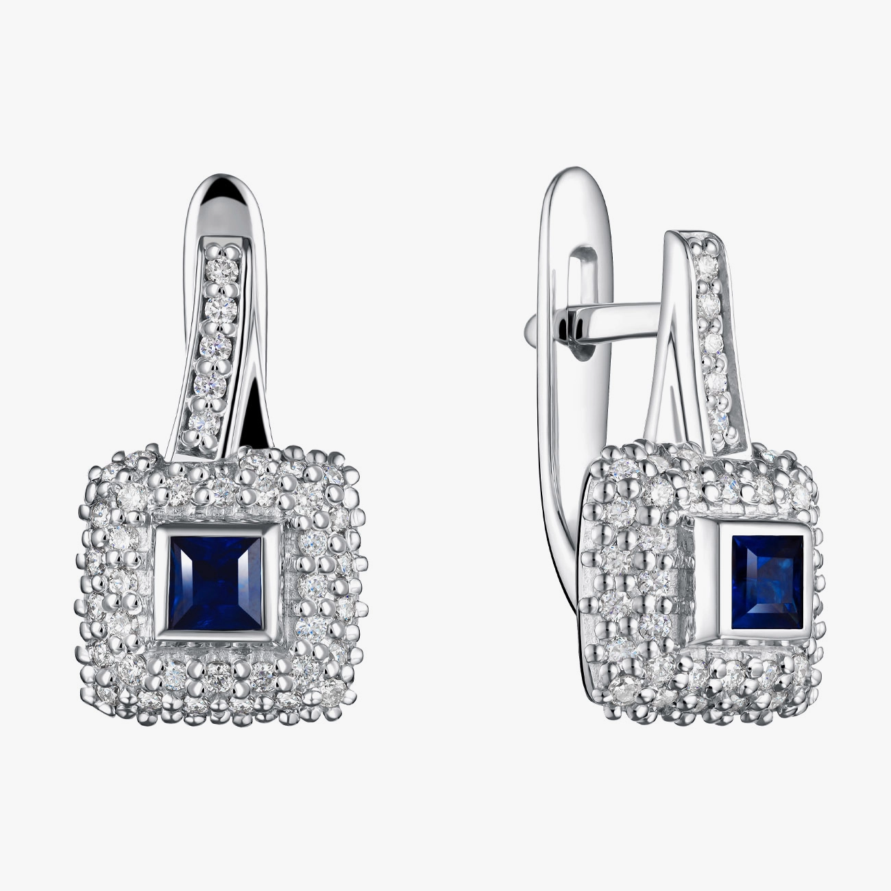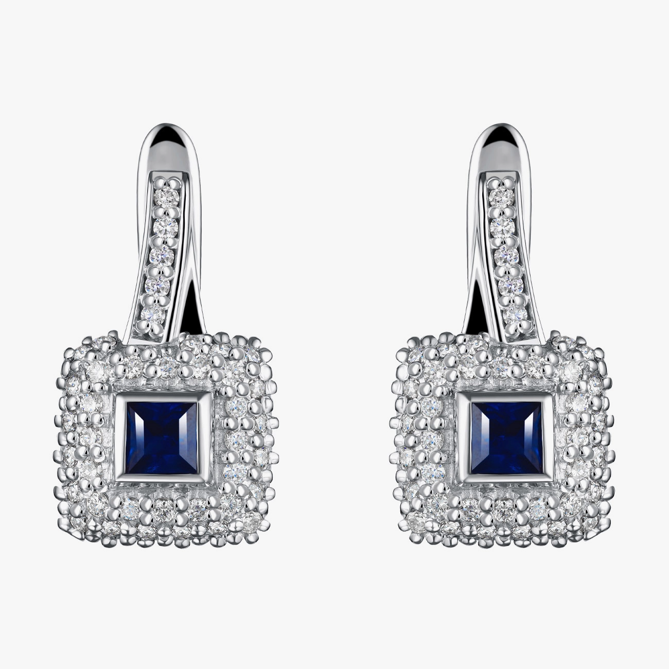 Изысканные серьги из белого золота украшены насыщенными синими сапфирами квадратной огранки в центре и обрамлены россыпью бриллиантов. Контраст глубокого цвета сапфира и идеального сияния бриллиантов создает элегантный и роскошный образ. Идеальный выбор для торжественных событий и особых моментов, когда хочется подчеркнуть индивидуальность и изысканный вкус.