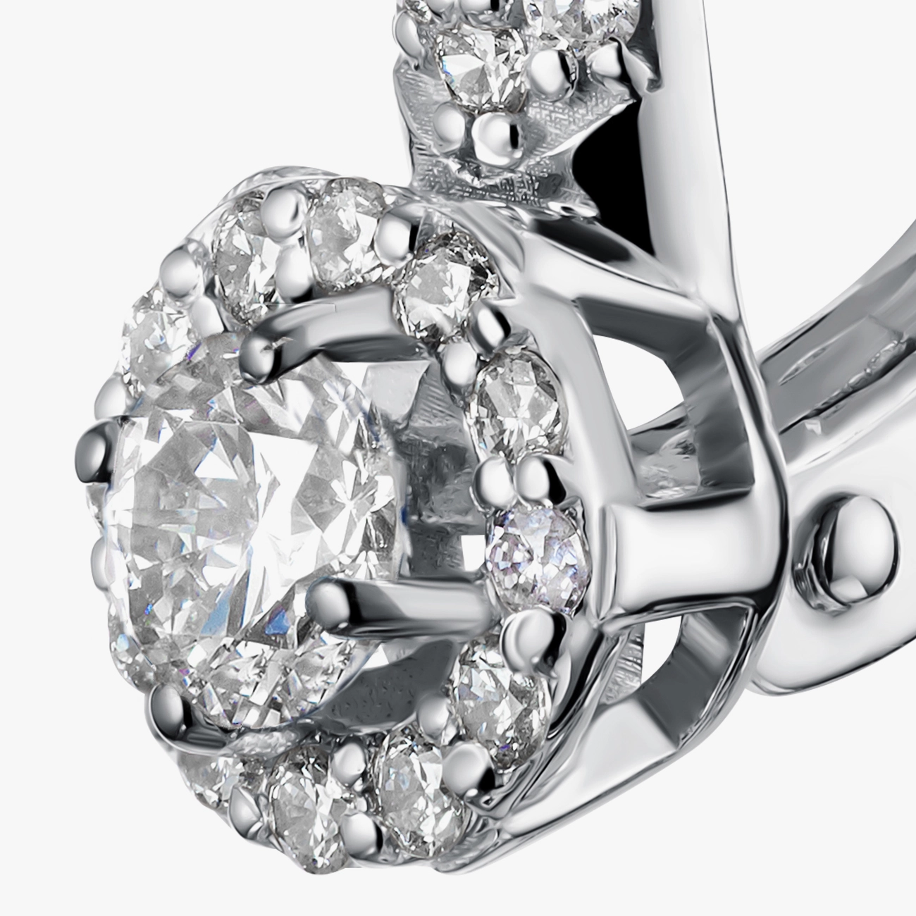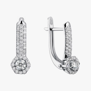 Изящные серьги из белого золота 585 пробы, украшенные центральным бриллиантом в сияющем обрамлении из мелких бриллиантов. Линия застежки инкрустирована бриллиантовой дорожкой, усиливающей блеск и придающей украшению выразительной вертикали. Английский замок обеспечивает удобную и надежную фиксацию. Эта модель сочетает классическую форму с современной подачей, делая серьги идеальным выбором как для повседневной носки, так и для особых событий.