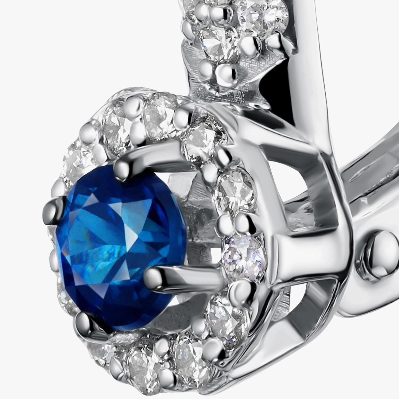 Элегантные серьги из белого золота 585 пробы, в центре которых сияют насыщенные синие сапфиры круглой огранки. Каждый сапфир окружен ореолом из бриллиантов, подчеркивающим глубину цвета и создающим эффект благородного сияния. Удлиненная часть серьг инкрустирована бриллиантовой дорожкой, придавая украшению изящества и визуальной легкости. Английский замок обеспечивает надежную фиксацию и комфорт в носке. Модель идеально подойдет для торжественных событий и станет роскошным упором в классическом или вечернем образе.